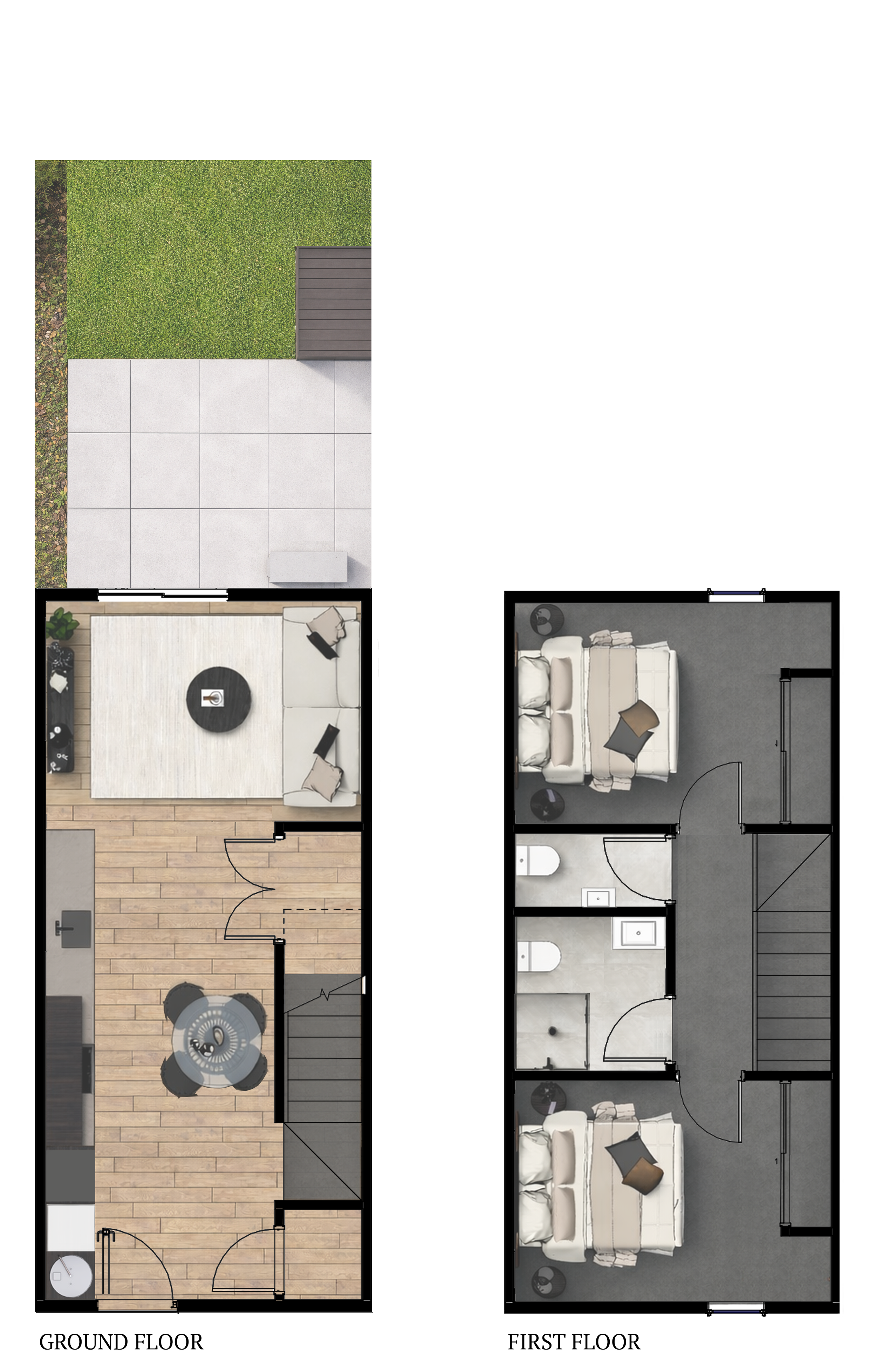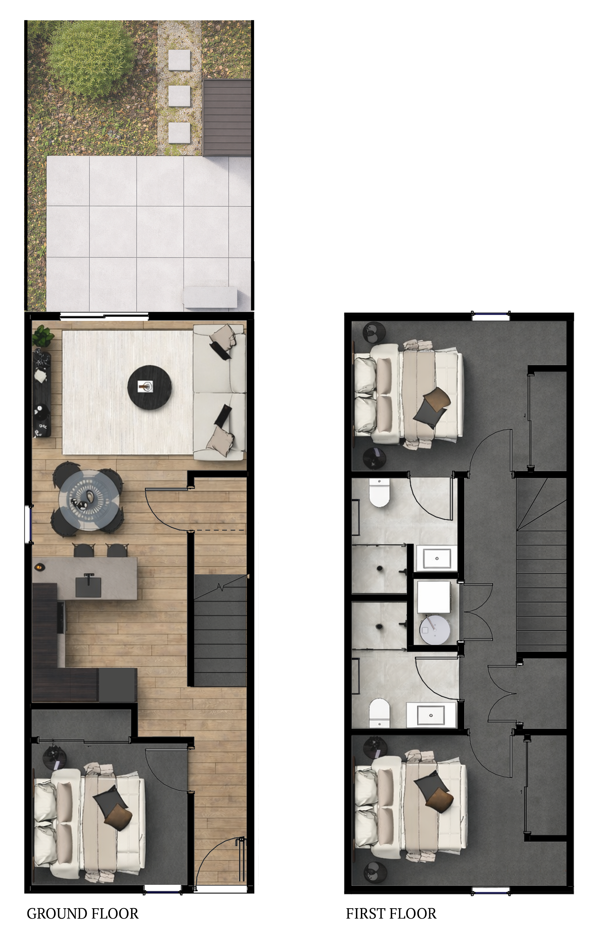 Efficient two-bedroom terrace designed for practical living with seamless indoor–outdoor flow and private courtyard.